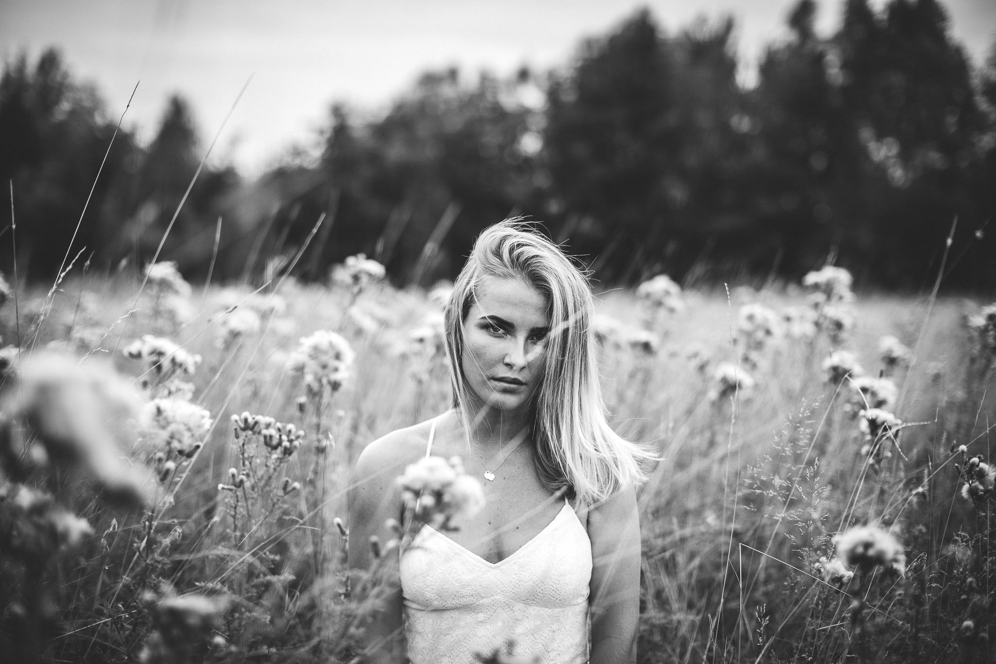 Mit Emma-Lina geht es raus in die Natur. Wohin auch sonst. Momentan gibt es keine schönere Location. Die ländlich geprägte Gegend um Hordorf hat zudem den Vorteil, dass die Spots nicht weit auseinander liegen. Hier ein dichter, dunkler Wald. Daneben die Naturwiese mit seinen mannshoch wachsenden Gräsern und über die Straße liegen die runden Strohballen auf dem Feld. Es ist beinahe windstill zwischen den Bäumen, nur wenig Licht erreicht den Boden. Der letzte Regen ist schon lange her, unter unseren Füßen rascheln trockenes Moos und Vorjahreslaub. Allerdings kündigt sich Regen an, graue Wolken ziehen über uns hinweg. Der Wind frischt auf, spielt mit Emma-Linas Haaren und treibt uns zur Eile an.